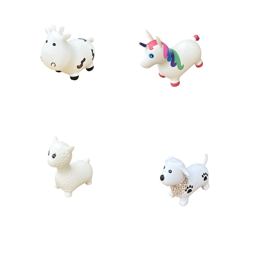 Choose the perfect playtime pack with our Custom Bouncy Hopper Bundle—where you choose the four adorable hopper toys from our growing collection of biomimetic animals! Whether it’s unicorns, llamas, cows, or our signature puppies, your little one will love bouncing alongside their favorite companions.