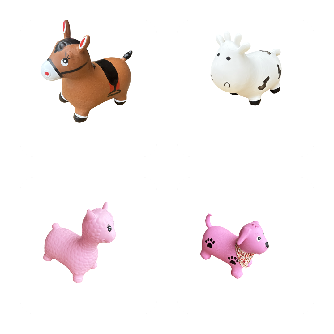 This bundle lets you mix and match four hoppers from our current inventory. Each toy features a charming design inspired by kids' favorite animals, complete with soft curves, sweet expressions, and toddler-safe comfort.