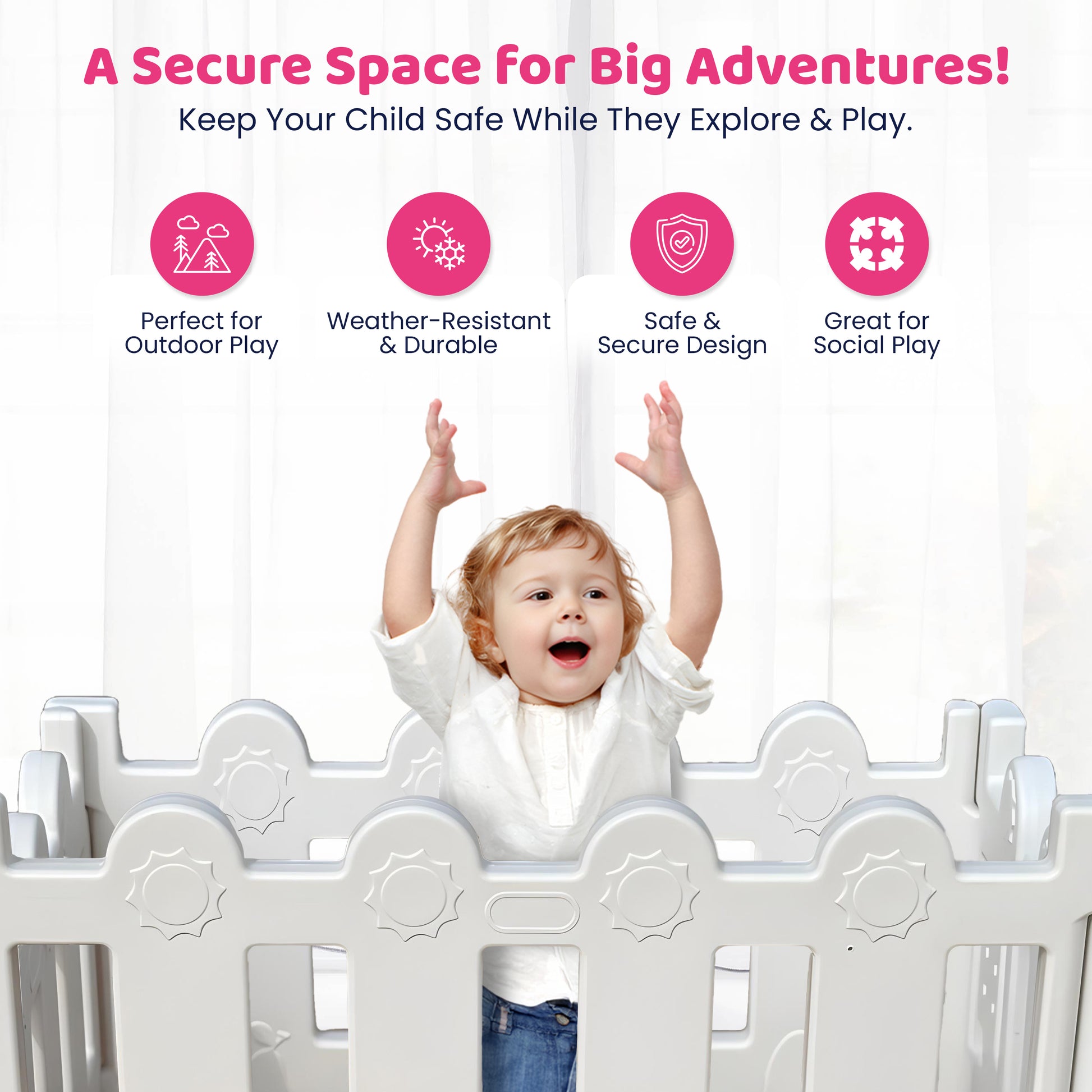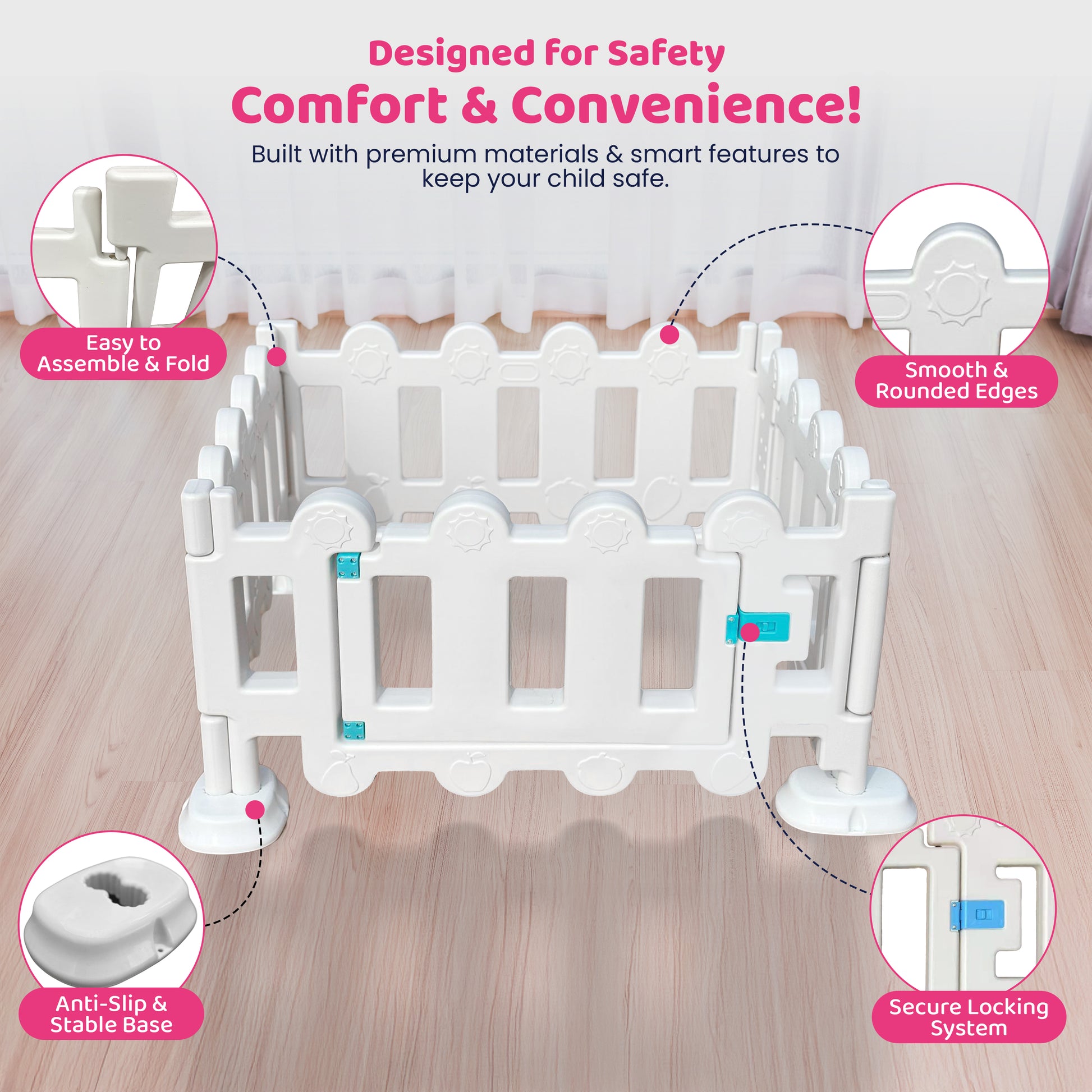 STURDY & SECURE: Designed with anti-slip rubber feet, our playpen stays firmly in place—no slipping or sliding. Plus, the added anti-stick arm design enhances stability, keeping the playpen steady as your baby explores.
